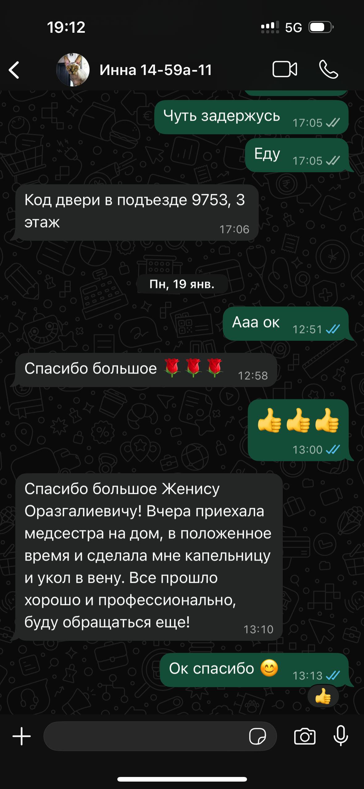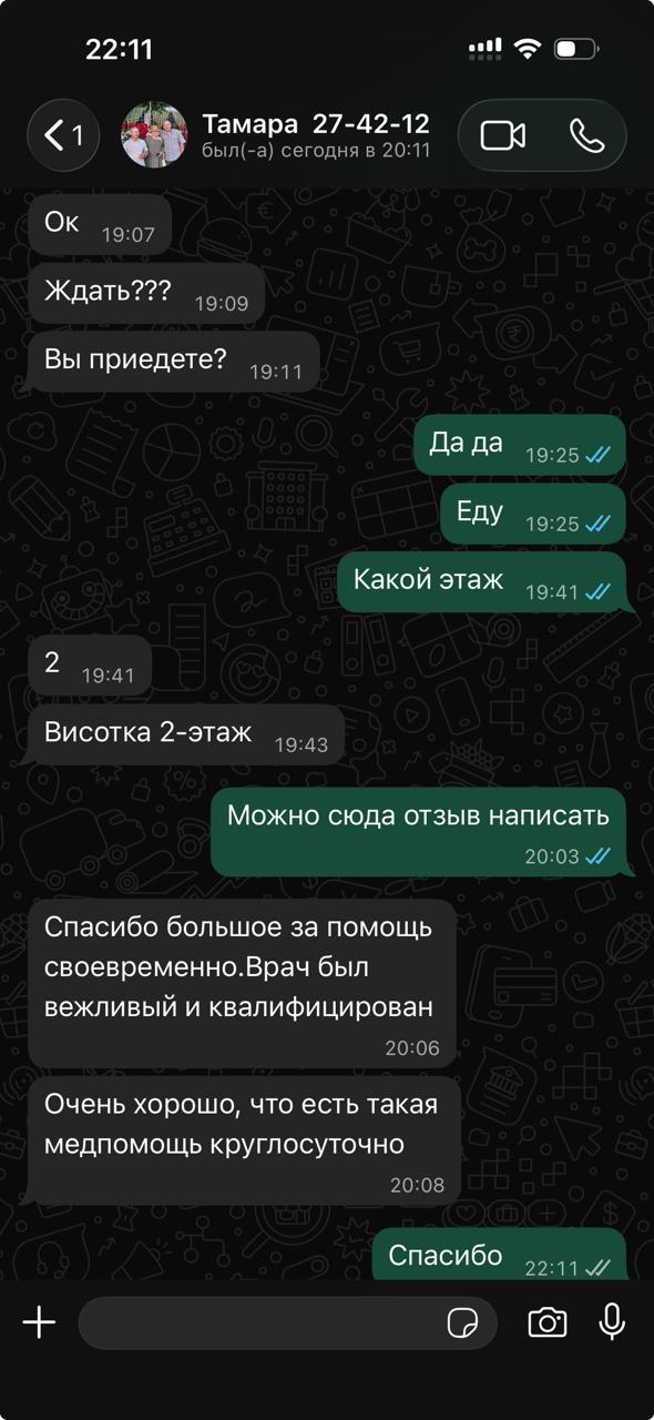 Вы пишете в WhatsApp или оставляете заявку. Уточняем адрес, жалобы, противопоказания и срочность.